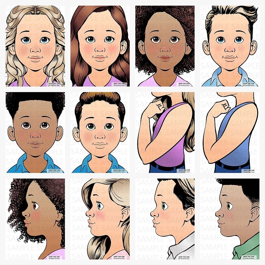 The Sparkling Faces boards are printed on A4 plastic sheets ( 8.3 × 11.7 inches )
