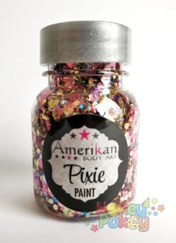 Pixie Paint is a blend of chunky and fine glitters along with our aloe glitter gel base. You can paint it on the face, body and hair. It’s perfect for glitter roots, cute accents on the cheeks and extreme coverage for dance clubs or festival body painting. Pixie Paint tends to stay put all day with very little fallout, but can be easily washed off with water.