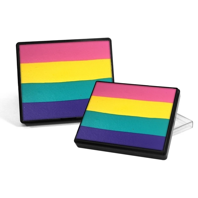 Rainbow cakes are excellent for base work for any design. They are used with a flat brush or sponge to create amazingly blended designs with one stroke. Rainbow Cake color combinations are designed to highlight and low light all with one container. Silly Farm carries over 20 different combinations of rainbow cakes designed to speed up your painting and help you create amazing designs. Rainbow cakes are also ideal for working with Pink Power stencils and Fast Faces kits. Expect 100-500 applications per rainbow cake.