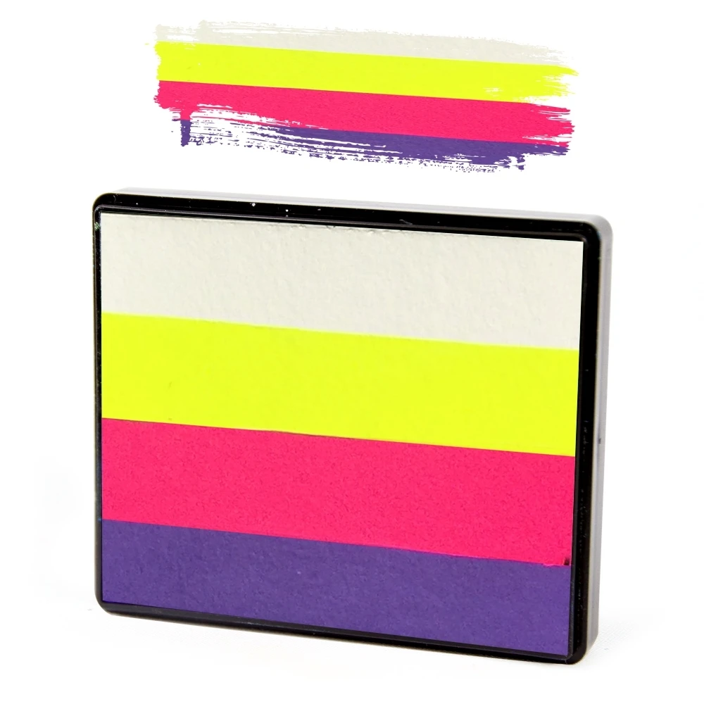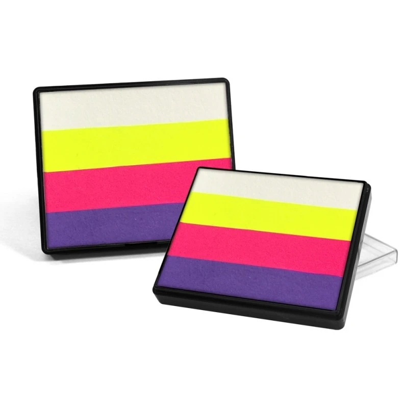 Rainbow cakes are excellent for base work for any design. They are used with a flat brush or sponge to create amazingly blended designs with one stroke. Rainbow Cake color combinations are designed to highlight and low light all with one container. Silly Farm carries over 20 different combinations of rainbow cakes designed to speed up your painting and help you create amazing designs. Rainbow cakes are also ideal for working with Pink Power stencils and Fast Faces kits. Expect 100-500 applications per rainbow cake.