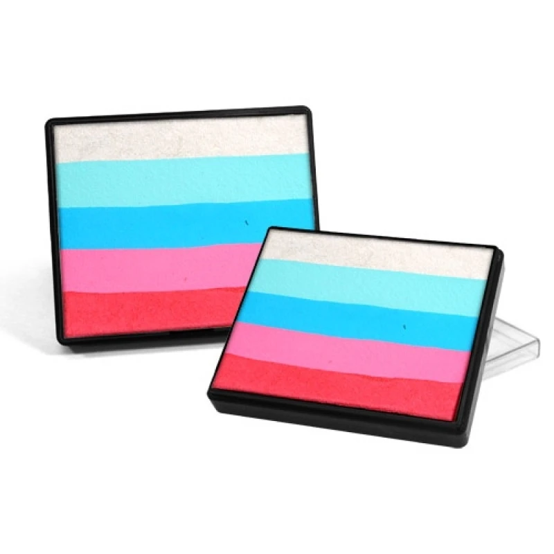 Rainbow cakes are excellent for base work for any design. They are used with a flat brush or sponge to create amazingly blended designs with one stroke. Rainbow Cake color combinations are designed to highlight and low light all with one container. Silly Farm carries over 20 different combinations of rainbow cakes designed to speed up your painting and help you create amazing designs. Rainbow cakes are also ideal for working with Pink Power stencils and Fast Faces kits. Expect 100-500 applications per rainbow cake.