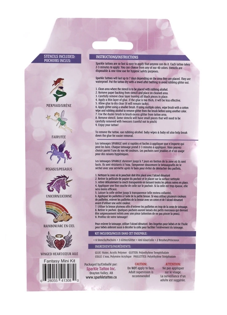 Don’t forget to clean skin with rubbing alcohol before applying glue. Wait a few minutes until glue becomes clear to adhere glitter, gems or prosthetic. Please note that swimming pools with chlorine or salt water, as well as ocean water can effect glitter tattoos. Manufacture reccommends to apply glitter tattoos once the pool time is over.