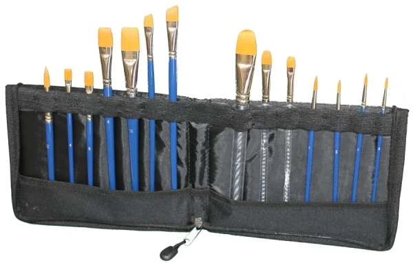 Holds at least 14 brushes in a neat wallet that opens and stands for easy access during painting.